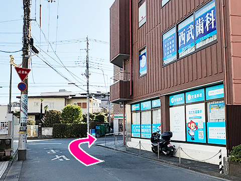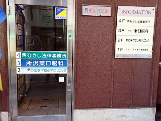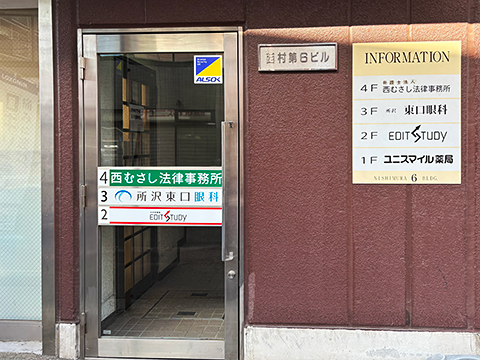 〈7〉1階右手に入口があります。4階が西むさし法律事務所です。