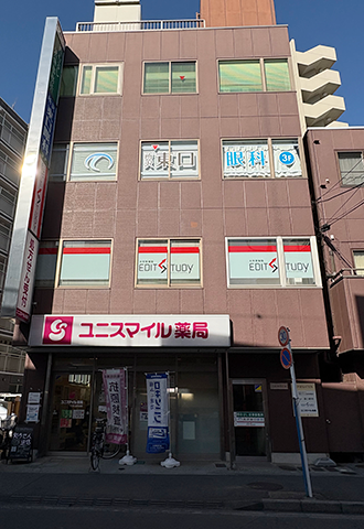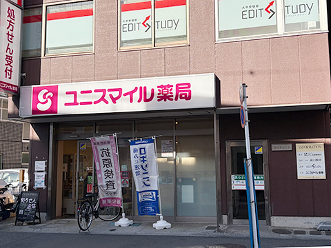 〈6〉すぐ右手に1階がユニスマイル薬局の建物=第六西村ビルがあります。