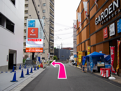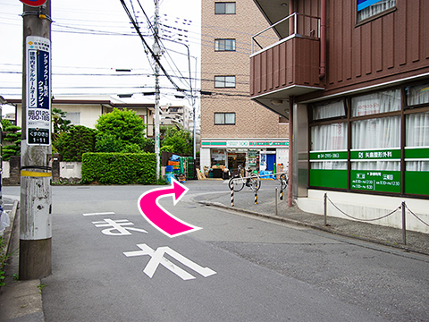 〈5〉突き当たり丁字路を右折します。100円ローソンが目印です。
