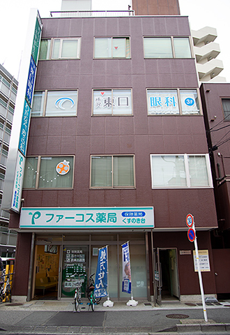 〈6〉すぐ右手に1階がファーコス薬局の建物=第六西村ビルがあります。